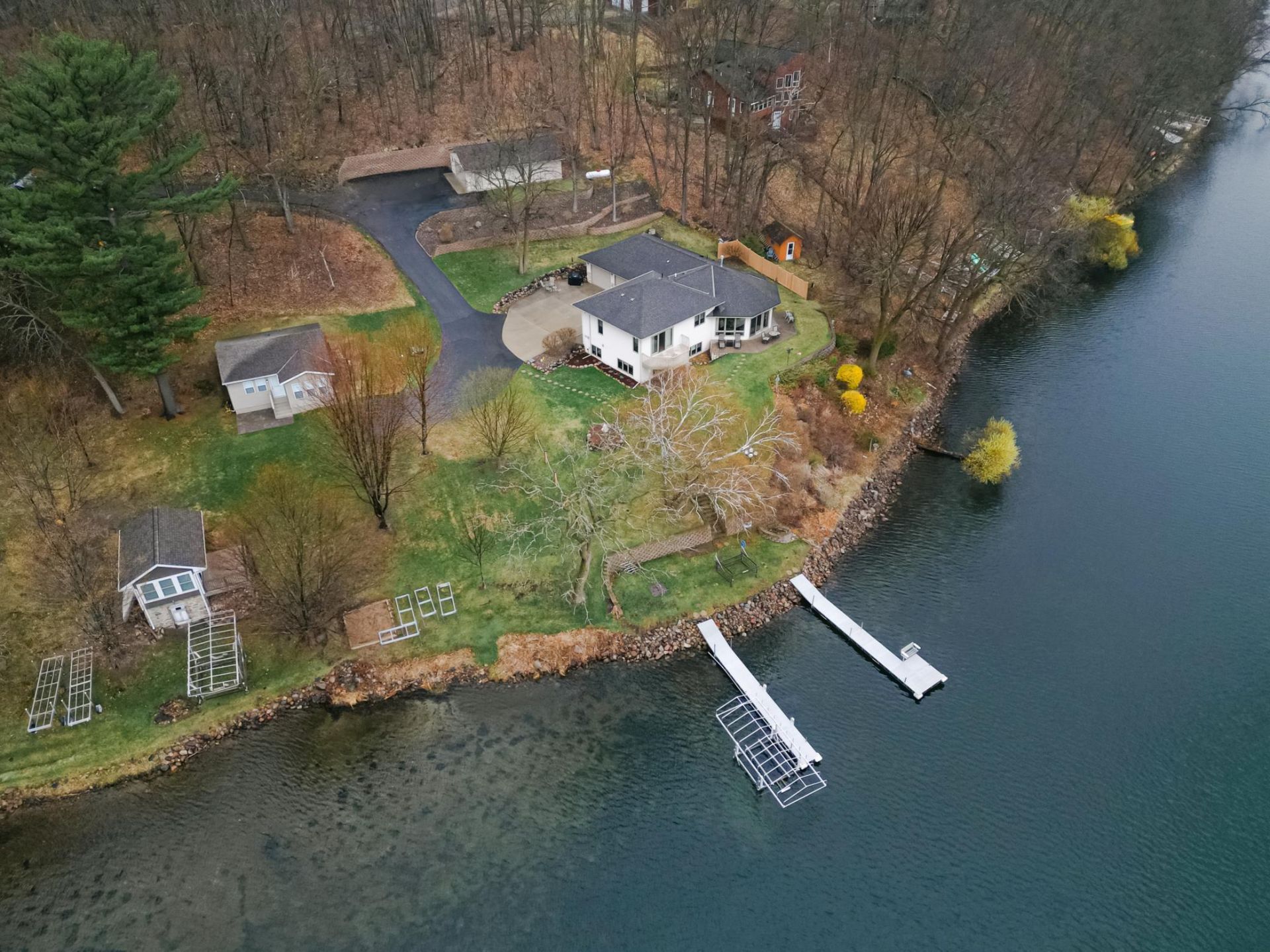 Experience elevated lakefront living on the shores of Fish Trap Lake. Set on an impressive 148 feet of pristine shoreline, this exceptional 3 bedroom/3 bath year-round retreat offers sweeping panoramic views, remarkable privacy, and the kind of natural beauty that turns everyday life into a getaway. From world-class walleye fishing right off your dock to the awe-inspiring sight of eagles soaring overhead, this is lake living at its finest.Inside, the home showcases timeless craftsmanship and thoughtful design, where no detail has been overlooked. A stunning floor-to-ceiling stone fireplace anchors the great room, complemented by granite countertops, a premium kitchen, and a whole-home hardwired surround sound system designed for effortless entertaining inside and out. Dual-fuel heating with in-floor heat, and central A/C throughout, ensures year-round comfort and efficiency.The spacious primary suite is a true sanctuary, featuring dual cedar walk-in closets with custom dressers, a maintenance free fiberglass balcony, and a luxurious spa-inspired bathroom complete with a Japanese soaking tub, glass block walk-in shower, and a double sink vanity.Outdoors, the property is equally impressive. Enjoy a fully equipped docking system, including two aluminum roll-in docks, permanent docking stations, and a 3,000 lb winch, along with a newer electric boat lift (2021). The patio provides endless opportunities to enjoy the beautiful lake views with friends and family. Attractively designed retaining walls, an in-ground sprinkler system, and hot/cold outdoor water spigots add both beauty and functionality to the landscape.Storage is abundant with an attached, heated and insulated two-stall garage, as well as a detached 24'x36' garage capable of accommodating up to four vehicles - perfect for your lake toys and hobbies.Significant updates include new Marvin windows throughout (2018), a full kitchen appliance suite (2020), and a new water softener (2023), ensuring peace of mind for years to come.This is more than a home - it's a lifestyle.Schedule your private showing and discover the rare opportunity to own a truly serene lakefront property.