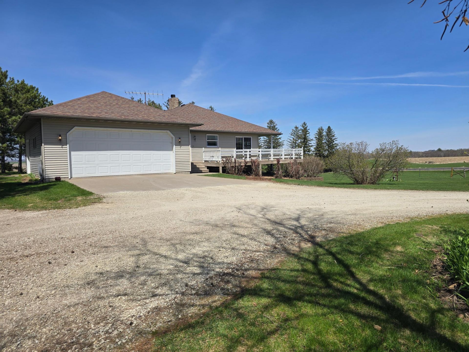 Premier Country Home on 4.5 Acres. Beautifully designed ranch-style home offering 3+ bedrooms and 2.5 baths, featuring vaulted ceilings and large windows that fill the space with natural light. The open-concept layout seamlessly connects the living and formal dining areas, highlighted by a striking double-sided fireplace?perfect for both everyday living and entertaining. The well-appointed kitchen includes abundant cabinetry, a breakfast bar, and an eat-in area with access to the deck. The main level primary suite features a walk-in closet and direct access to the main bath, while a second bedroom, additional bath, and main-floor laundry complete convenient one-level living. The lower level adds flexibility with a third bedroom offering daylight windows with a walk-in closet, full bath, and framed in fourth bedroom or home office area. The remaining space is insulated and wired, ready for your custom finish. Set among mature trees with attractive landscaping and a spacious garden area, the outdoor setting is just as inviting to spend quality time outdoors. The outbuildings include a 45' x 90' free-span shed with a heated shop, 16' sidewalls, and oversized doors?ideal for RVs, equipment, or hobby use?plus a 30' x 30' pole building with fenced pasture for added versatility for livestock. Conveniently located on hard surface road just 35 minutes to Rochester, MN or La Crosse, WI, and 20 minutes to Winona, with the Root River and scenic trails in Peterson just minutes away, this property offers the perfect blend of accessibility and peaceful country living. Love where you live from sunrise to sunset.