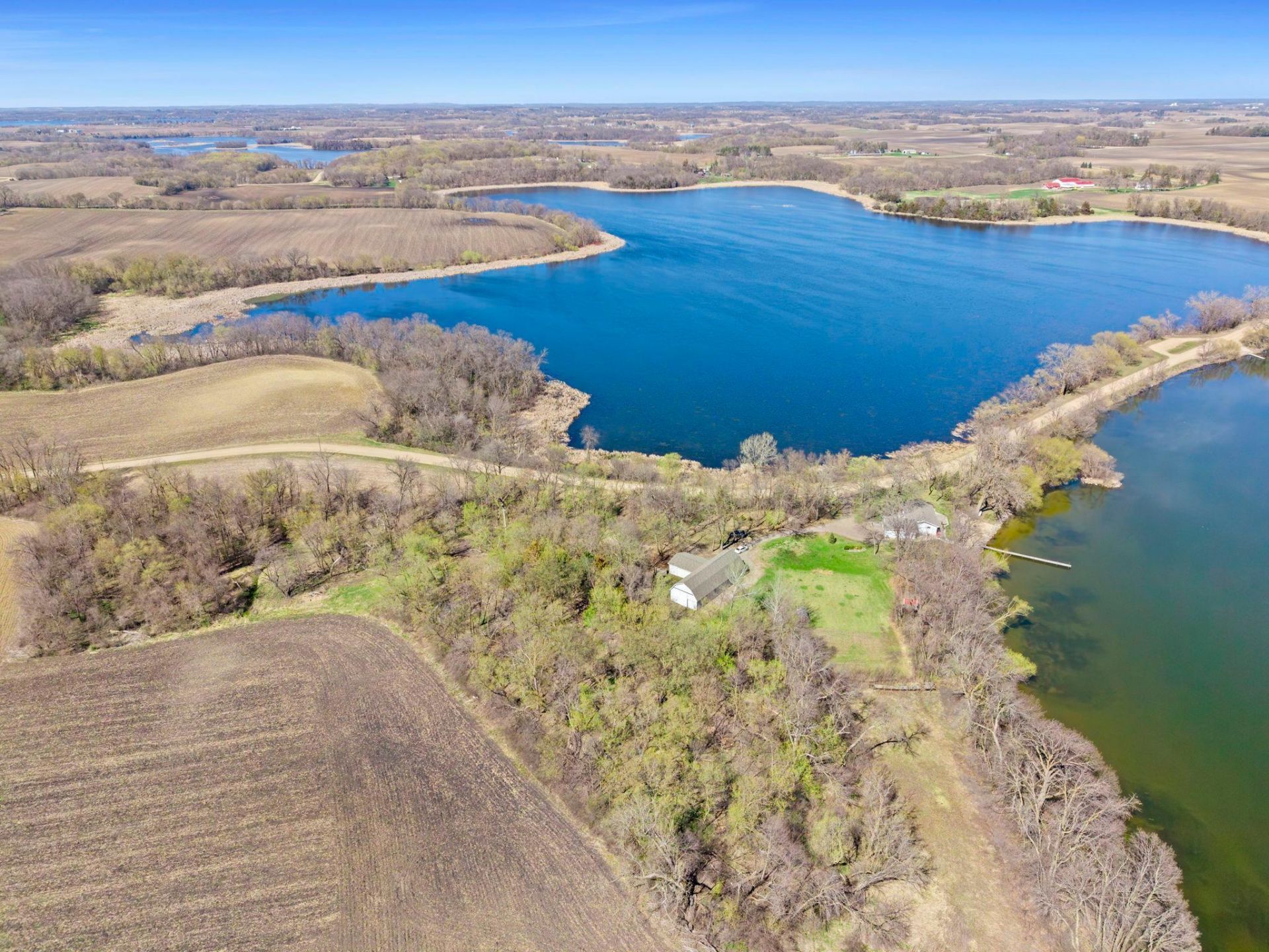 Experience the lake life dream on this stunning acreage property featuring over 300 feet of pristine shoreline and sweeping panoramic views. From sunrise reflections to golden hour evenings, this setting delivers the kind of waterfront living people imagine but rarely find. A private sandy beach, lakeside boulder retaining wall, and included dock make it effortless to step right into the water and enjoy every season on the lake. Thoughtful exterior updates elevate the entire property, including a new lower patio with stairs, stone retaining wall, refreshed front entry paver patio with limestone stoop, and beautifully crafted lakeside steps descending to the shoreline. Home & Barn newly shingled in 2025 coupled with an exterior home transformation: steel siding with soffit, facia and gutter guards highlighted by maintenance free landscape. The double deep barn/pole building features an unfinished loft and an attached, oversized two car garage with workshop area and ample storage space plumbed for in-ground heat. Loft potential for guest quarters, rec room, or home office. For those who enjoy hobby farm living, a newer chicken coop is ready to go. Pet owners will appreciate the invisible fencing system with collars included. Inside, the home continues to shine with new appliances, a new water heater, a fully remodeled main bathroom, and fresh paint throughout. Every update supports a lifestyle centered around comfort, nature, and the unmatched beauty of lakeshore living.